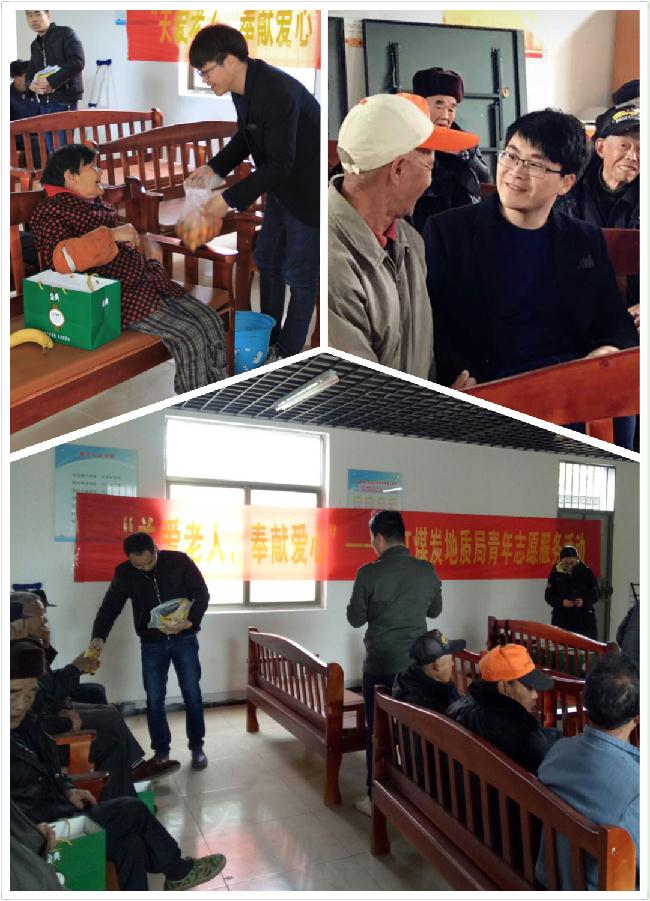 在院长陪同下,浙江煤炭地质局8名青年志愿者走进多湖敬老院活动中心,给14名老人送去牛奶水果等慰问品,与他们亲切交谈,了解他们在敬老院的衣食住行、看病就医和休闲活动。