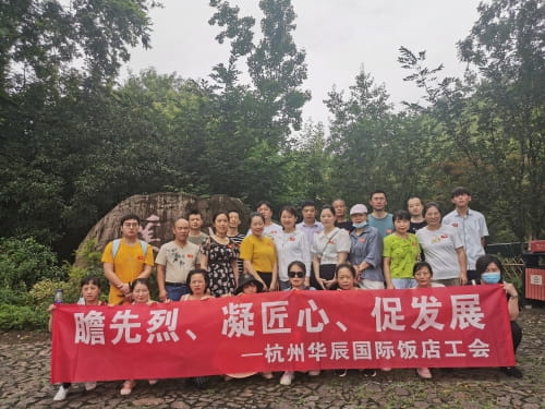 96名员工共同前往周恩来纪念室参观学习,大家在绵绵细雨中相互搀扶,杭州华辰国际饭店工会组织开展,参观学习之余,一边交流讨论参观心得。