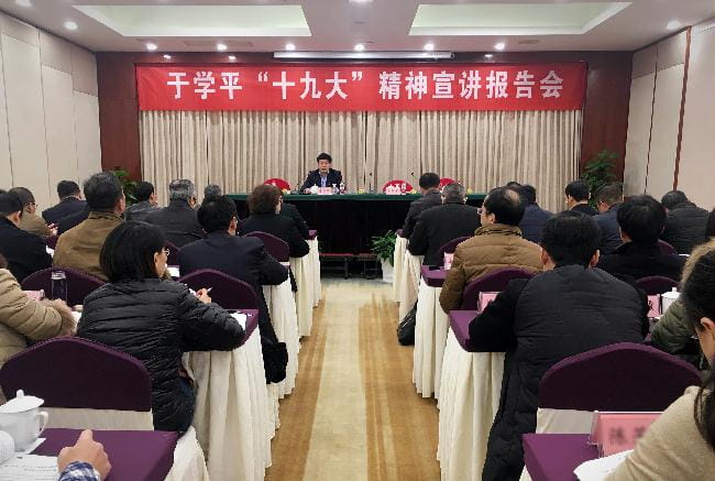 于学平从党的十九大的重大历史意义、精神内涵两大方面作了一个系统全面的宣讲报告。于学平指出,这次大会把习近平总书记在全党的核心地位,把习近平新时代中国特色社会主义思想确立为必须长期坚持的指导思想写入党章,这是党的指导思想又一次与时俱进,是党的十九大最大的亮点和最重要的历史贡献。深刻领会党的十九大精神内涵要把握六个方面:一是要深刻学习领会习近平总书记作为党中央核心、全党核心的重大意义;二是要深刻领会习近平新时代中国特色社会主义思想的核心要义和丰富内涵;三是要深刻学习领会党和国家事业取得的辉煌成就;四是要深刻学习领会中国特色社会主义进入新时代、我国社会主要矛盾发生变化等重大论断的深远影响;五是要深刻学习领会分两步走全面建设社会主义现代化国家的战略目标和重大部署;六是要深刻学习领会新时代党的建设总要求。