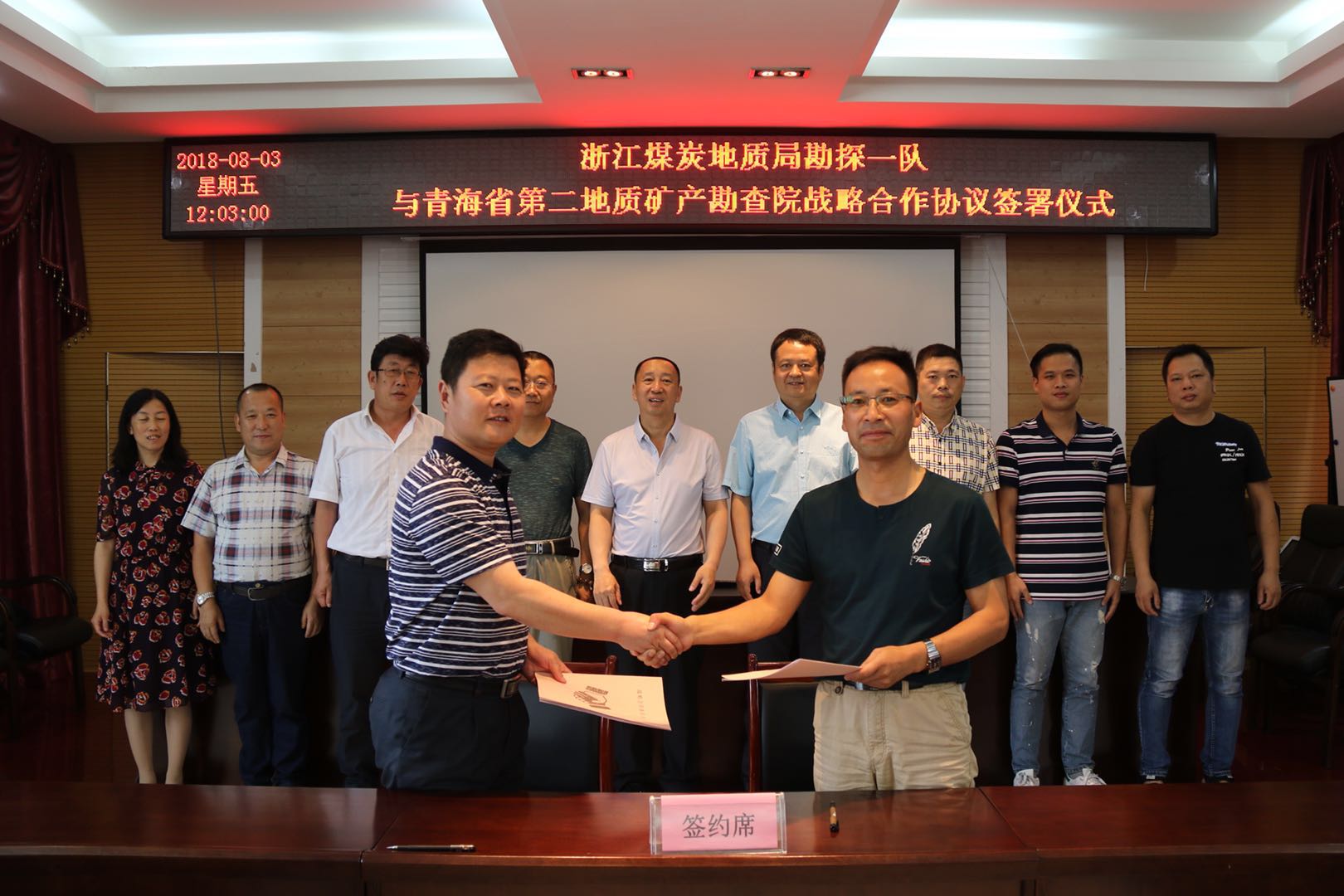 8月3日,浙江煤炭地质局(浙江中煤实业集团有限公司)勘探一队与青海省第二地质矿产勘查院签署战略合作协议。浙江局(公司)副局长、副总经理张雄邦、青海地矿局副局长孙王勇及双方单位代表参加了签约仪式,勘探一队队长夏明强与二勘院院长刘鹏分别代表双方单位签字。