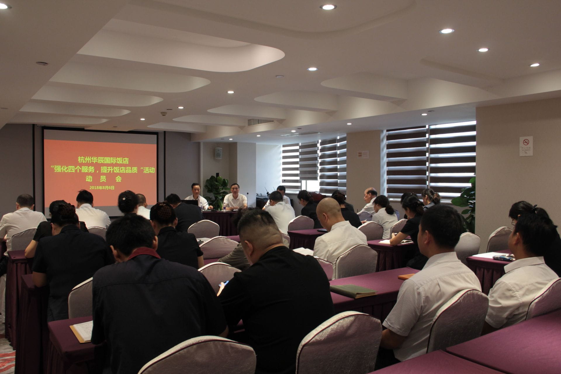 8月6日,杭州华辰国际饭店召开“强化四个服务,提升饭店品质”活动动员大会,主管以上管理人员和各部门文员参加。