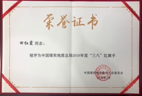 工作至今她共获得的“先进生产者”等荣誉称号19次,2018年更被中国煤炭地质总局评选为“三八红旗手”。她参与的项目多次取得国家级、省级荣誉,其中“嘉善县城乡一体新社区及零星地块数字地籍调查及数据入库”项目获得2014年度中国测绘学会优秀测绘工程银奖;“遂昌县1:500城镇数字地籍调查(南区段)” 获得2015年全国优秀测绘工程奖铜奖;“嘉善县规划保留及新建农居点与零星地块数字地籍调查与数据入库工程” 获得2017年度浙江省优秀测绘与地理信息工程银奖;“淳安县第二、三期村庄数字地籍调查项目” 获得2017年度中国测绘学会优秀测绘工程铜奖。