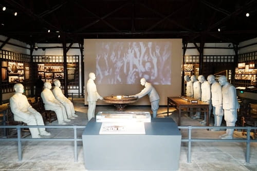 1937年7月7日抗日战争全面爆发后的同年12月24日,浙江省杭州市富阳县城沦陷。日军在长新乡宋殿村烧杀淫掠,无恶不作,甚至挖坑把无辜遭其杀害的数以千计的中国同胞抛在坑里,史称“千人坑”。中国人民经过八年浴血奋战,1945年8月15日,日本宣布无条件投降。1945年9月4日,侵驻浙江日军投降仪式在此举行。1945年底,富阳长新乡改名为受降乡,宋殿村也改名为受降村。受降大厅内,还摆放着当年受降的桌椅和受降刀。