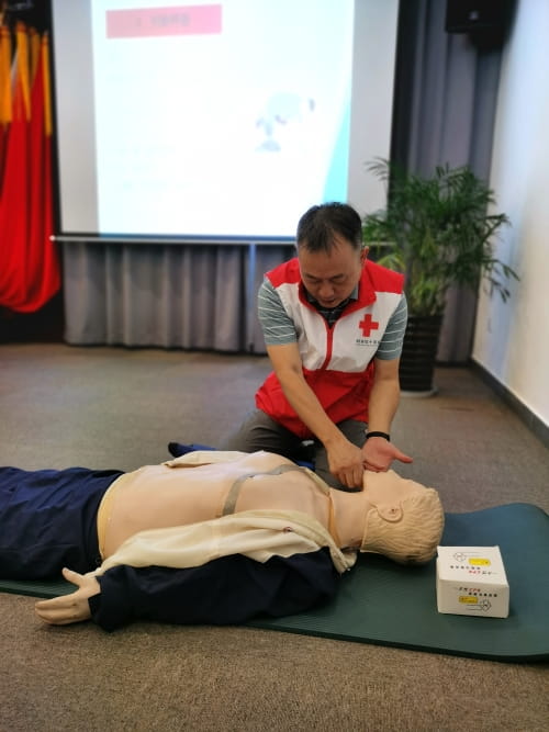 本次培训由湖州市红十字会资深培训专家讲授,采用理论讲解和实际操作相结合的教学方式,生动直观地讲解和演示心肺复苏的具体操作、自动体外除颤器的使用、气道异物梗阻的急救方法、中暑的应急救护、动物咬伤的现场处理、创伤和骨折包扎处理等知识和具体操作方法。
