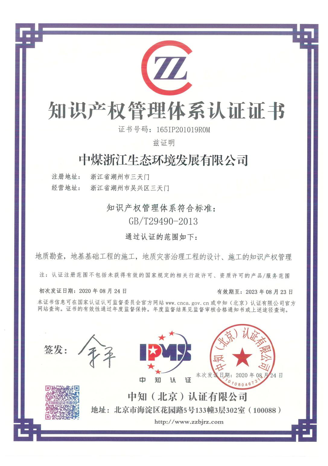 8月24日,中煤浙江生态环境发展有限公司顺利通过国标《企业知识产权管理规范》(GB/T29490-2013)认证,取得“知识产权管理体系认证”证书。认证范围包括地质勘查、地基基础工程的施工、地质灾害治理工程的设计及施工。