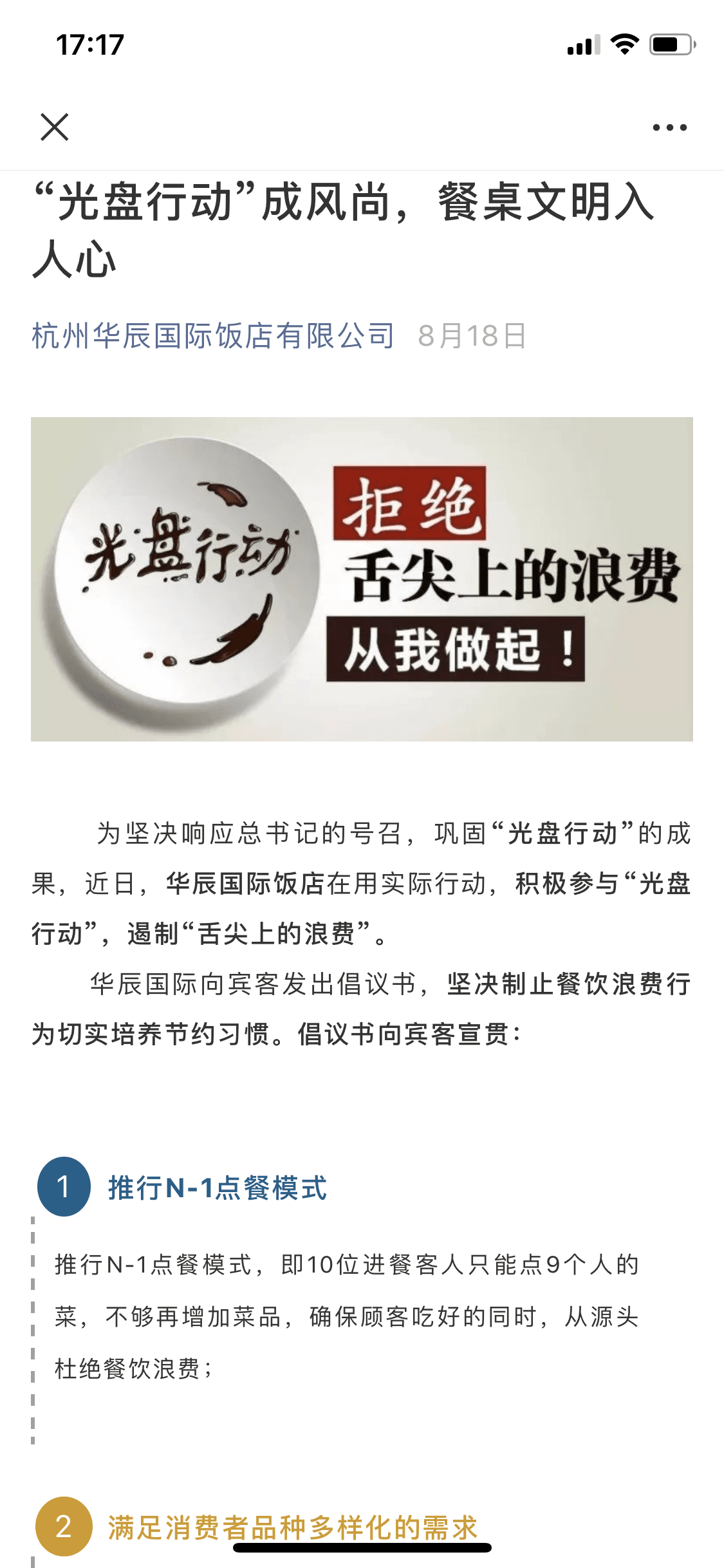 浙江局(中煤浙江)所属单位杭州华辰旅业作为餐饮服务单位把厉行节约、反对浪费要求体现到经营管理全过程。倡导绿色餐饮,科学设计菜品,提高食材利用率,在为宾客点菜服务时着重进行适量提醒,用完餐后主动为客人进行剩菜打包,在外卖送餐服务时多次征询用餐意见确保不造成浪费,引导理性消费、人走桌清,切实减少宴席浪费、自助餐浪费。除基本动作外,华辰国际饭店推行N-1点餐模式,即10位进餐客人只能点9个人的菜,不够再增加;推出半份菜和小份菜,兼顾节约与满足消费者品种多样化需求。