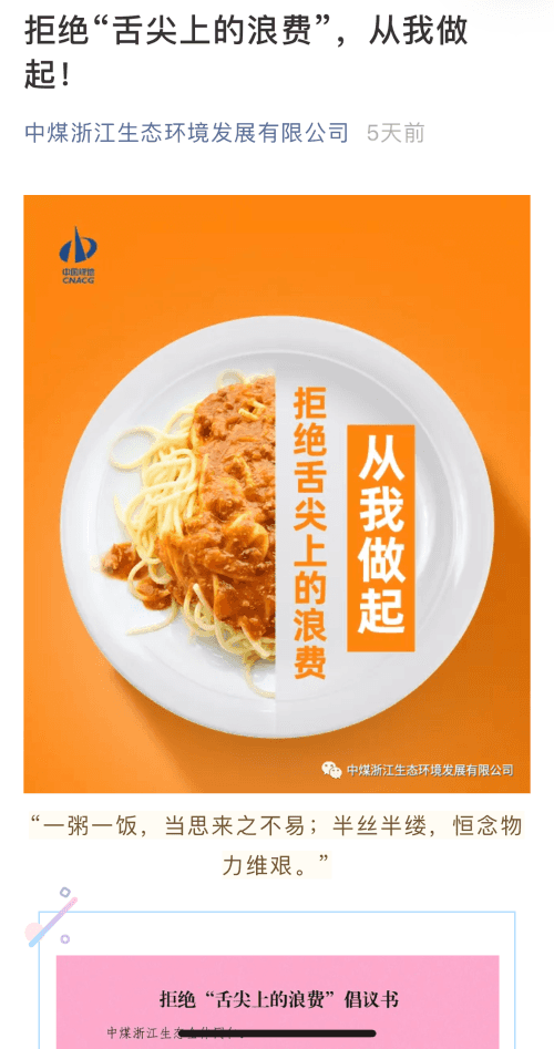 全局上下迅速通过企业微信、订阅号、网站、宣传窗等平台进行大力宣传。第一时间在浙江局(中煤浙江)企业微信“学习强企”专栏发布图文《节约:永不过时的美德》,宣传习近平总书记关于制止餐饮浪费行为的经典语录、减少餐饮浪费的方法,弘扬勤俭节约的中华美德。在内部报纸《中煤浙江地质》9月总第2期第四版,用10幅图片进行同步宣传。
