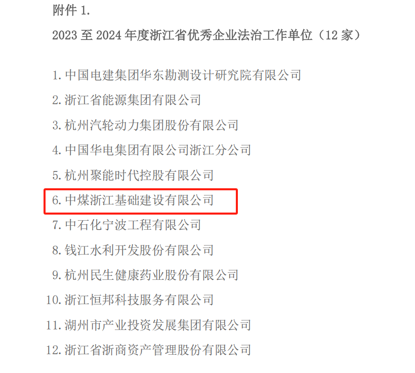 近日,中煤浙江基础建设有限公司荣获浙江省企业法律顾问协会评选的“2023-2024年度浙江省优秀企业法治工作单位”称号。