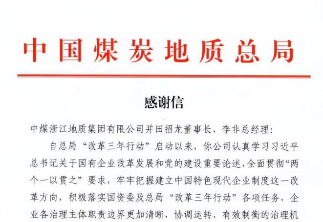 日前,总局深化改革领导委员会办公室在《中煤浙江地质集团有限公司“改革三年行动”专项检查评审报告》(2022年5月23日)中指出,浙江煤炭地质局(中煤浙江地质集团有限公司)领导高度重视、工作推进有力、成效显著、特色亮点较多,重点改革任务全部完成,同时积极配合总局改革工作及相关工作,综合评价为“优秀”,并收到总局感谢信。
