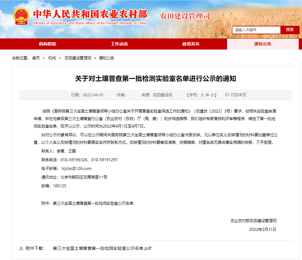 4月1日,国家农业农村部对第三次全国土壤普查第一批检测实验室名单进行了公示,全国共126家实验室入选,中煤浙江检测技术有限公司名列其中。