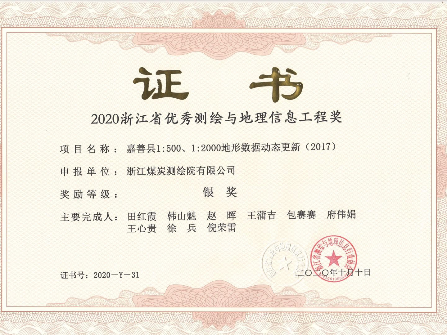 荣获2020浙江省优秀测绘与地理信息工程银奖,2020浙江省优秀测绘与地理信息工程奖,2000地形数据动态更新项目,对浙江煤炭测绘进一步加强测绘地理信息工程项目管理水平具有重要意义,浙江省测绘与地理信息行业协会公布。